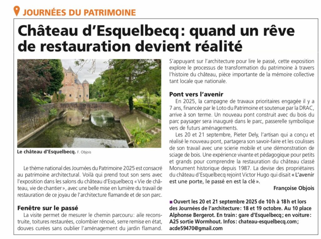 Journées Européennes du Patrimoine 2025 « Fenêtres sur le passé, pont vers l’avenir » au Château d’Esquelbecq Venez…